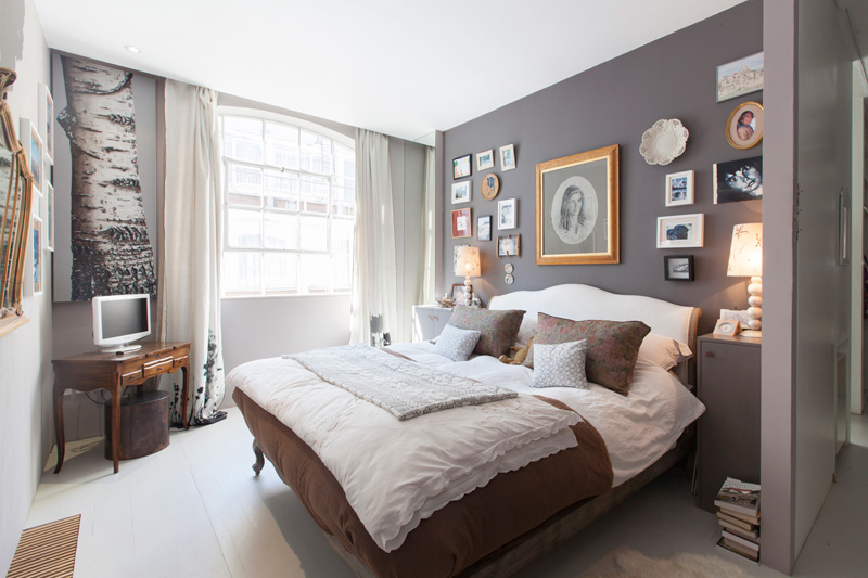 Раздвижные дверцы на шкафу позволяют одеться в этой маленькой спальне, оформленной на двуспальную кровать.